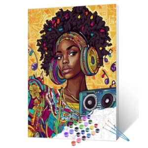 DIY Paint by Numbers 大人用 ロックミュージック ガール ペイント アクリルペイント デジタル油絵 アフリカ系アメリカ人女性 ペインティングキット 若い黒人の女の子 キャンバスアート 寝室の装飾 16×20インチ (フレームなし)