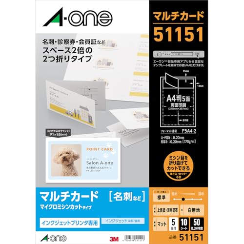 エーワン マルチカード 名刺2つ折り 5面 50枚分 51151は、名刺作成に最適な印刷用カードです。A4サイズで、デザインの自由度が高く、簡単に加工できます。アイデア次第で幅広い用途に活用可能です。