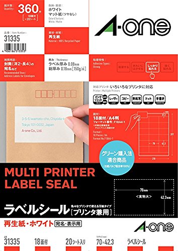 エーワン ラベルシール 再生紙 18面 20シート 31335は、エコに配慮した再生紙を使用したラベルシールです。シール面は18面で、様々な用途に対応。使いやすく、プリンターで簡単に印刷できます。