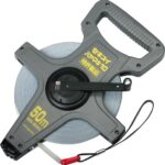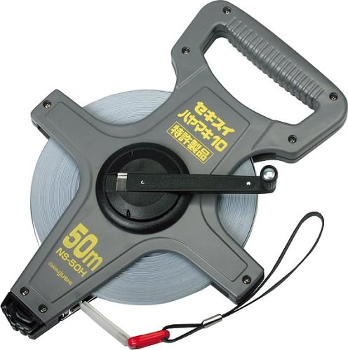 エスロンのハヤマキタイプ巻尺は、10mm幅のナイロンスチールテープで、50mの長さを持ち、片面目盛が特徴です。3倍速巻取り機能を搭載し、効率よく作業をサポートします。
