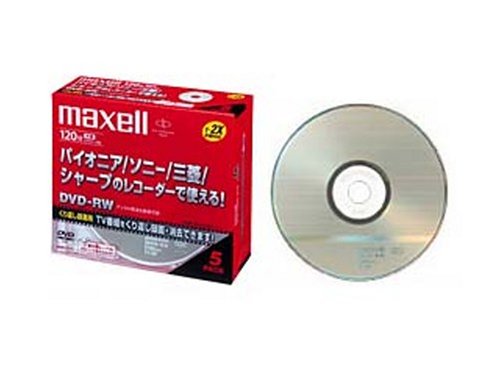 maxellの録画用2倍速DVD-RWは120分録画可能で、5枚パックに1枚ずつ5mmケース入り。イージーセレクト仕様で、使いやすくデータの書き換えも簡単です。