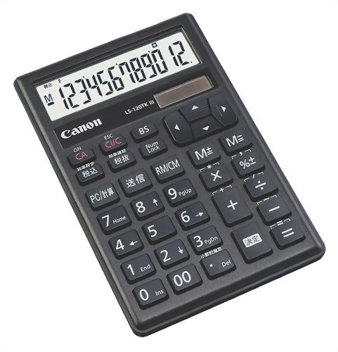 Canon LS-120TKIII-BKは、12桁表示のテンキー電卓です。軽量で持ち運びに便利。メモリー機能や税率計算機能も搭載。エコ設計で、太陽電池と電池の両方で動作します。