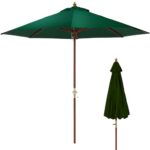 不二貿易のガーデンパラソルは、展開時最長辺270cmでUVカット率99.9%を実現。折りたたみ可能な大型木製モデルで、自然なグリーンのデザインが魅力です。