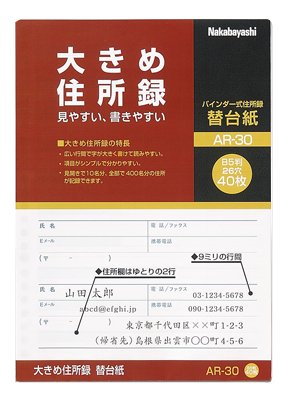 住所録バインダー式B5替台紙AR-30は、整理しやすいB5サイズで、必要情報を余白に自由に書き込めるタイプ。複数のページが収容可能で、持ち運びやすく、使いやすい設計です。