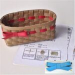 紙バンド手芸用ホビーテープ トライアルキットには、ブルーのリボン付きバスケットが含まれています。カラフルな紙バンドで手軽にアートを楽しみ、バスケット作りを体験できるキットです。