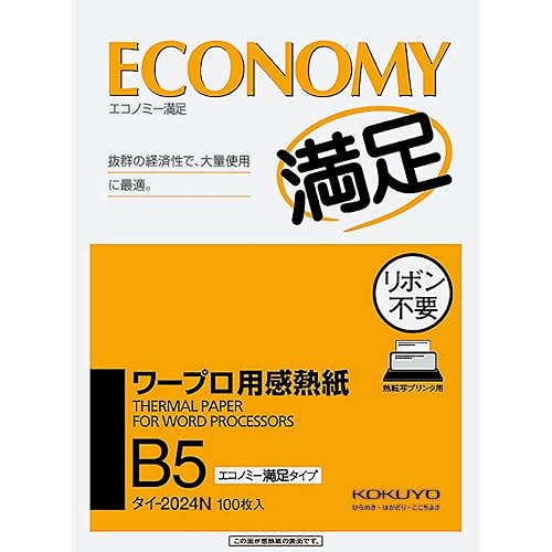 コクヨのワープロ用感熱紙エコノミー満足タイプはB5サイズで、タイ-2024です。経済的で高品質な印刷が期待でき、ビジネス文書に最適です。