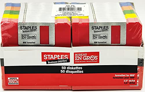 Staplesの50パック3.5インチマルチカラーFDは、1.44MBのPC/IBM形式でフォーマットされています。データ保存に最適なフロッピーディスクです。