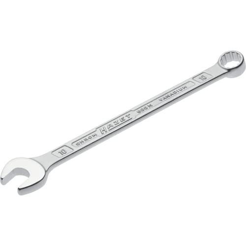 ハゼットのコンビネーションスパナ600N-10は、クロームメッキ仕上げで耐久性があり、ヘッド角度15°、外径二重六角、フラット幅10mm、ユニット寸法154.5mmです。頑丈なダブルTプロファイルが特徴で、日本正規輸入品です。