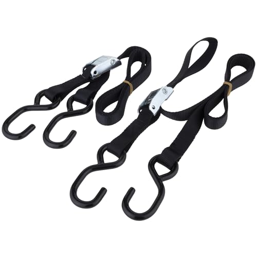 キジマのトランポ用タイダウンベルト(25x1800mm)は、汎用性の高いブラックのバックルが付いた2個入りセットです。頑丈な作りで荷物の固定に最適です。