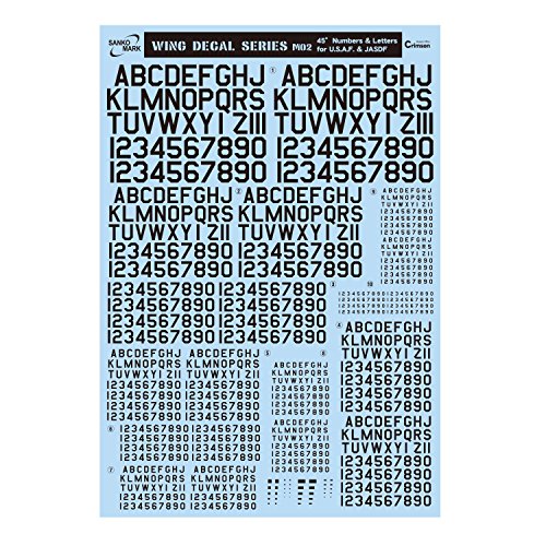 サンコーマーク工業のレプトジーダ用水転写デカールM02。45度の数字と文字が黒色で、サイズは13.5×19.5cm。WING DECAL SERIES WM-07で精密な仕上がりを追求。