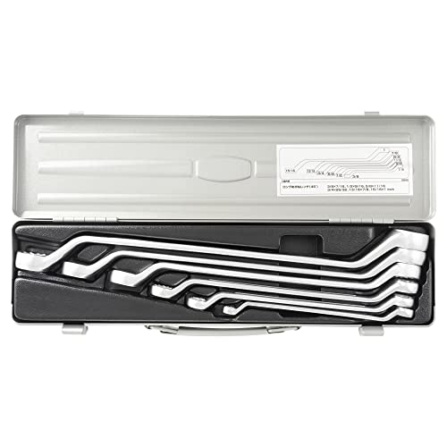 トネ(TONE)のロングめがねレンチセット(45°)2600は、シルバーの6点セット。高耐久性の鋼材使用で、狭いスペースでも作業効率を向上。多様なサイズを揃え、プロフェッショナルにも最適です。