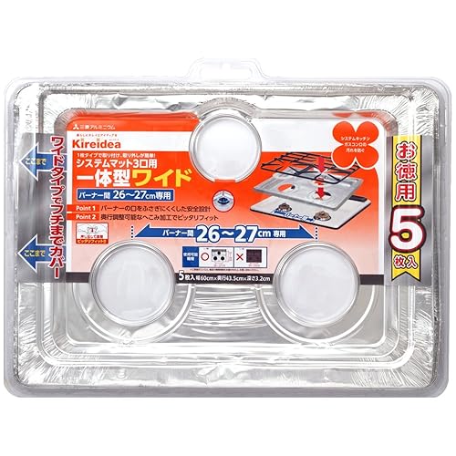 エムエーパッケージングのkireideaシステムマットは、日本製の3口用一体型ワイドタイプ。バーナー間26-27cm専用で、ふちまでカバーし、5枚入。使い勝手が良く、清潔感を保ちます。