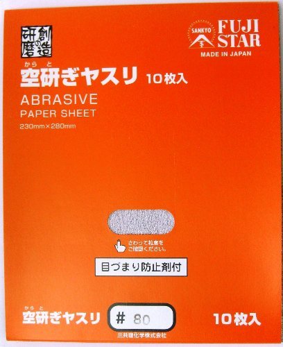三共理化学の空研ぎヤスリ #80は、10枚入りで、粗い仕上げや素材の削りに最適です。耐久性が高く、木材、金属、プラスチックなど様々な素材に対応し、均一な仕上がりを実現します。