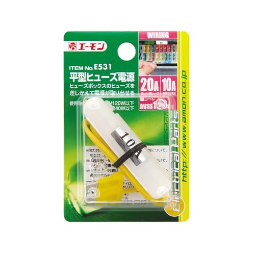 エーモン(amon)の平型ヒューズ電源は、20Aヒューズ差替用E531の後継品で品番4849です。高い安全性と信頼性を備え、車両電装品の電源供給に最適です。