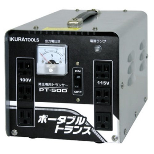 育良精機 ポータブルトランス PT50Dは、AC200Vを降圧する専用トランスです。小型で持ち運び便利、主に工事現場や電動工具の電源供給に最適です。安全設計が施されています。