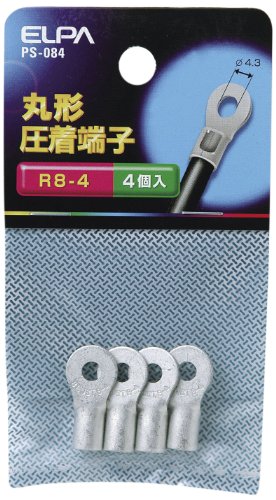 エルパ(ELPA)の丸端子R8-4は、丸形圧着端子です。4個入りで、23.8mmのサイズ。対応単線径は2.89~3.65mm、より線は6.64~10.53㎟。型番はPS-084です。
