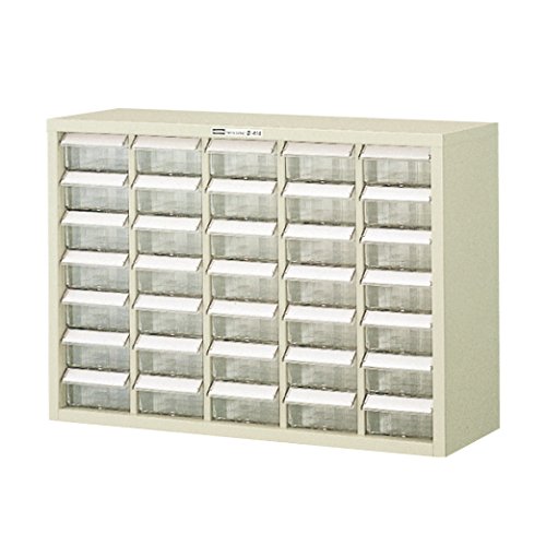 ホーザンのパーツキャビネットB-414は、35個の引出しを備え、ストッパー付きで部品をしっかり収納。見出しカードと転倒防止金具が付属しており、整理整頓に最適です。