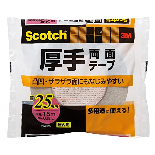 スリーエム(3M) スコッチ 両面テープは、厚さ0.5mm、幅25mm、長さ15mの製品です。ポスターやべニア板の接着に最適で、凸凹やざらざら面にも対応しています。ホワイト色のテープです。