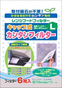 三菱アルミニウムのレンジフードフィルターは、日本製で磁石付。浅型・深型兼用のホワイトで、46cm×1.8mサイズ。厚さは約2.5倍、吸油力は約2倍で、手で切れるタイプです。