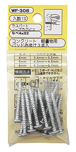 和気産業のコンクリート軽量物用ノープラグビスアンカーWF-308は、ナベ4×32サイズで、軽量物の固定に最適です。手軽に取り付けでき、強力な保持力を提供します。