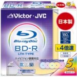 Victorの映像用ブルーレイディスク LTHは、1回録画用で130分の収録が可能。容量25GB、4倍速対応。ハードコートの保護コート付きで、カラープリンタブル仕様です。5枚入りで日本製。