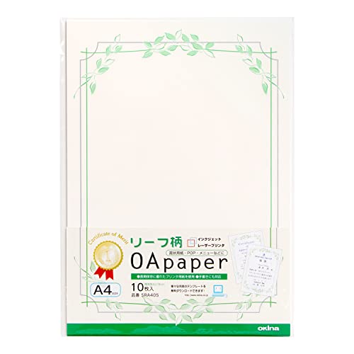 オキナ賞状用紙A4横書き10枚入り、リーフ柄デザインで、プリンタ対応です。美しい仕上がりで、表彰状や証書に最適です。サイズはSRA405で、オフィスや学校で幅広く使用されています。