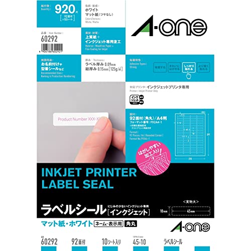 エーワン ラベルシール インクジェット 92面 10シート 60292は、印刷面が白く、各ラベルは簡単にカット可能。高品質なインクジェット印刷に対応し、プレゼンや商品のラベリングに最適です。