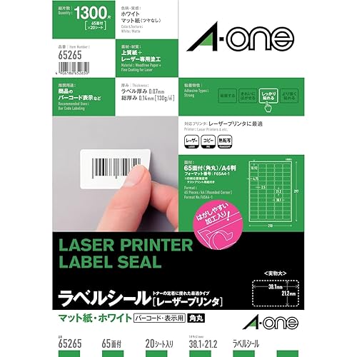 エーワン ラベルシール レーザー 65面 20シート 65265は、高品質なレーザープリンター用ラベルシールです。65面のシートが20枚セットで、用途に応じたラベル作成が可能です。使いやすく、鮮明な印刷が特長です。