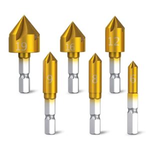 皿取り錐ドリル 面取りカッター ビット ドリル ビット 6 個のカウンター 6mm -19mm 高速度鋼 5 フルート 82 度センター パンチ ツール 1/2”-5/16” 下穴錐 座ぐり 六角軸 穴あけ工具 木工カッタ バリ取り 電動 セット(6本セット)