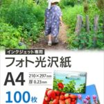 フォト光沢紙 A4サイズ 0.23mm厚、100枚入り。高品質な写真印刷が可能で、鮮やかな発色とシャープな画像を実現。印刷後も魅力的な光沢感が持続します。