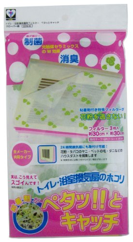 新北九州工業の浴室・トイレ用換気扇フィルターは、抗菌・消臭機能でハウスダストや花粉、PM2.5を防ぎます。日本製で、貼るだけの簡単設置。サイズは30cm、3枚入り。