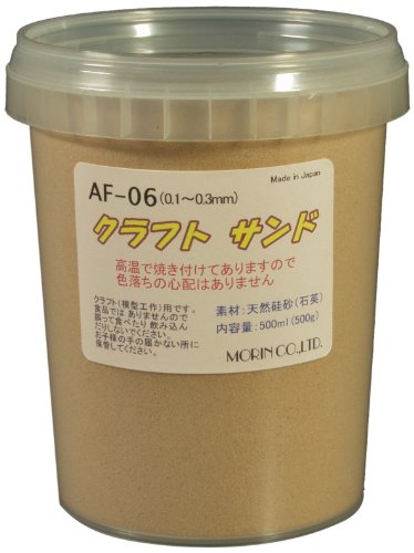 モーリン AF-06 クラフトサンドは、0.1~0.3mmの粒子サイズを持つ黄土色のサンドです。500mlのプラカップに入っており、様々なクラフトやデコレーションに最適です。自然な質感を加え、作品に立体感を出します。