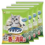 デオサンドはオシッコの後に香りで消臭する猫砂です。ナチュラルグリーンの香りが広がり、5Lの袋が4つセットになっています。優れた吸水性で、ニオイをしっかりキャッチし、快適な環境を提供します。