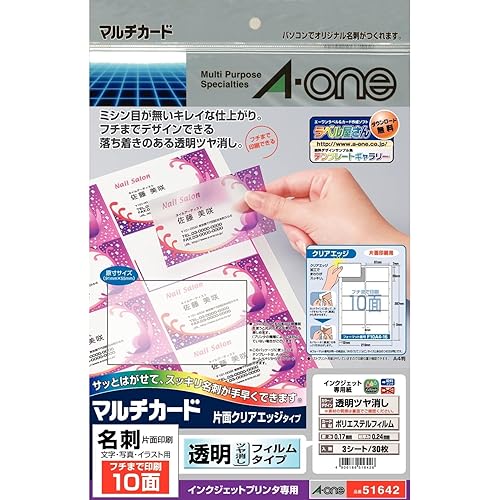 エーワン名刺マルチカード透明ツヤ消しは、フチまで印刷可能で、30枚分入っています。高品質な仕上がりを実現し、名刺作成に最適です。自宅で簡単に名刺を作成できます。