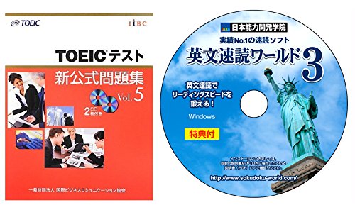 TOEICテスト新公式問題集〈Vol.5〉は最新の出題傾向を反映した問題集で、リスニングとリーディングの対策が可能。『英文速読ワールド3』は速読力向上に特化したテキストで、実践的な英文を通じて読解力を養う。