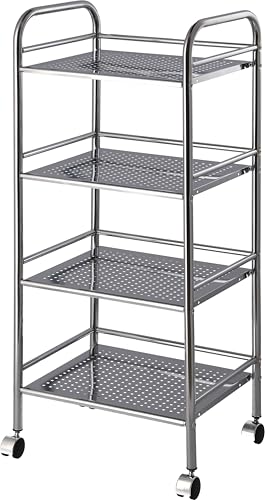 不二貿易のキッチンワゴンは、幅40×奥行32×高さ97.5cmの4段ラックです。シルバーのスチール製で、キャスター付きで移動が容易。キッチン収納に最適な組立商品です。