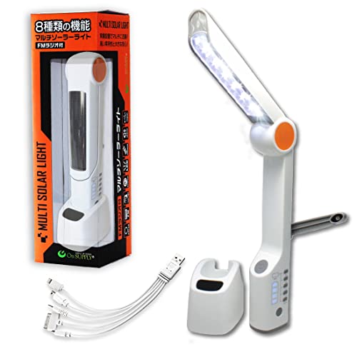 マルチソーラーライトはデスクライト、手回し発電、懐中電灯、FMラジオ機能を搭載。スマートフォン充電&緊急時サイレン機能付き。スマートフォン用プラグも付属。