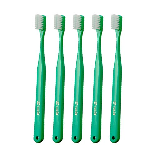 キャップなしタフト24歯ブラシは、25本入りのSサイズで、鮮やかなグリーン色のデザインです。毛先がやわらかく、歯と歯茎に優しく、しっかりとしたブラッシングをサポートします。
