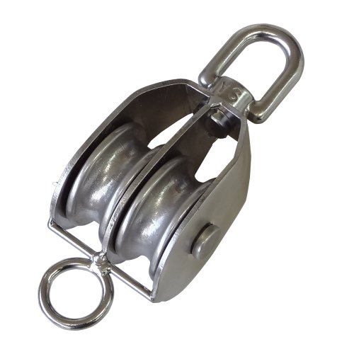 ステンレス製のブロック(滑車)2車オーフは、直径50mmで耐久性に優れ、錆に強い設計です。軽量で取り扱いやすく、さまざまな吊り上げ作業に適しています。