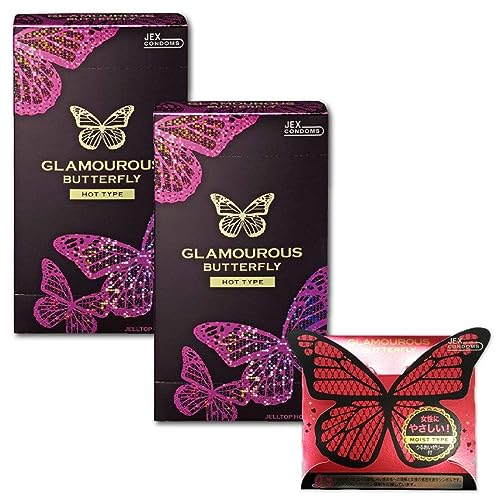 ジェクスのグラマラスバタフライホットタイプは、12個入が2箱と1個のサンプル付きのまとめ買いセット。デザイン性と快適な使用感を追求し、温感効果でプレイを演出します。