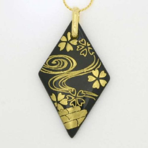 京焼 清水焼 ペンダント 黒塗金彩花いかだ(菱形) KP031Bは、伝統的な京焼の技法を駆使した美しいアクセサリーです。黒塗りに金彩で華やかな花柄が施され、上品で洗練されたデザインが特徴。ギフトにも最適な一品です。
