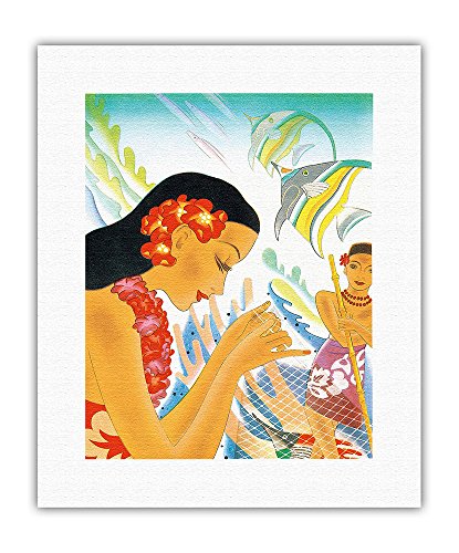 / 海のギフト – ハワイアン女性釣りネットを修復( _ Upena ) – Vintage Ocean Linerメニューカバーby Frank Macintosh c.1930s – ハワイアンFineアートプリント 11″ x 14″ Rolled Canvas APBX213