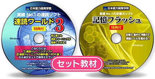 「速読術トレーニングソフト + 速読術トレーニングの教科書【PDF版】」と「記憶力トレーニングソフト」のCD2枚組。初級から上級編まで対応し、特典付き。効果的なトレーニングで、読解力と記憶力を向上させる商品です。