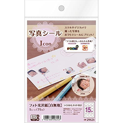 エーワン 写真シール フォト光沢紙 15面 5シート 29624は、高画質な写真印刷が可能なシール用紙です。15面に分かれており、ラベル作成に最適で、クリアな光沢仕上げで写真や大切な思い出を美しく残せます。