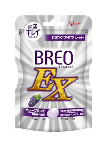 BREO EX グレープミントは、江崎グリコの口中ケア用シュガーレスタブレットです。舌をきれいにし、さわやかな息を提供。66g入りで、手軽に舌苔ケアができます。