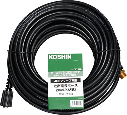 工進(JCE-1107/JCE-1408)用延長ホース20m PA-265は、ネジ式ゴムホースで耐久性があり、柔軟性に富んでいます。黒色のデザインで、様々な用途に対応可能です。