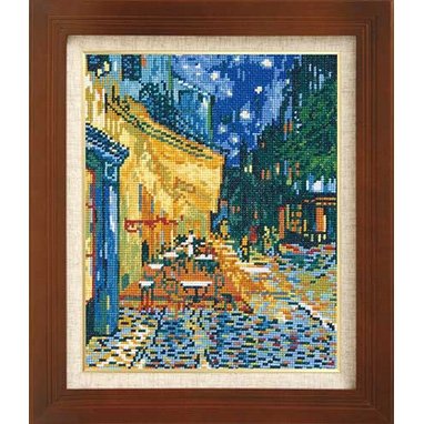 オリムパスNo.7214のクロスステッチキット「夜のカフェテラス」は、ゴッホの名作を刺繍で再現。美しい色合いと細やかなデザインが特徴。初心者から上級者まで楽しめる内容。