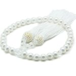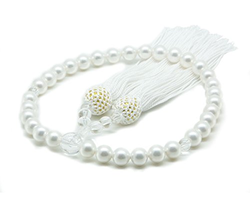 まつよ 花珠貝パール数珠は、女性用の高級日本製念珠です。ホワイト8mmの珠を使用し、全宗派で活用可能。数珠袋セット付きで、天然貝核と水晶を使用した上質な製品です。