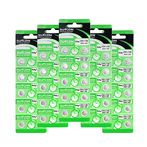 SUNCOM LR41 アルカリボタン電池10個パック x 5シート(計50個)は、高品質なアルカリ電池で、時計やおもちゃなど幅広い機器に対応。長寿命で安定した性能を提供し、コストパフォーマンスに優れています。
