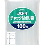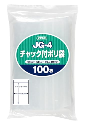 ジャパックスのチャック付きポリ袋は、透明で縦34cm×横24cm、厚み0.04mmの収納袋です。強力なチャックでしっかり閉まり、100枚入りで便利です。